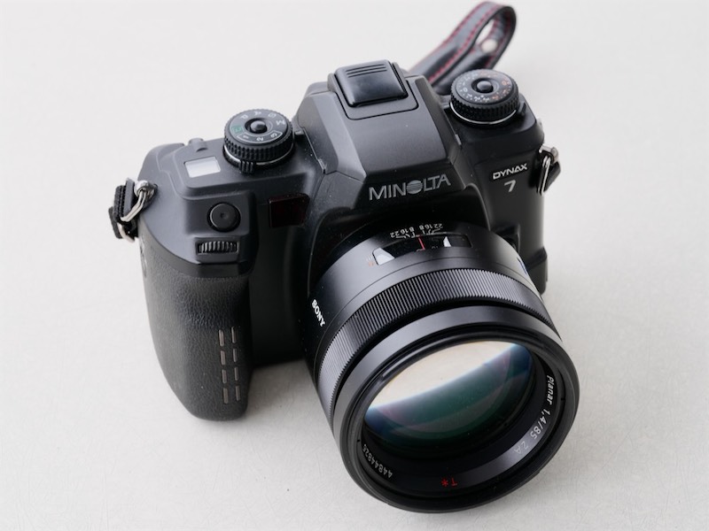 Nebenan ist eine analoge Minolta Dynax 7 Kamera mit einem Sony Planar 1,4/85mm Objektiv.