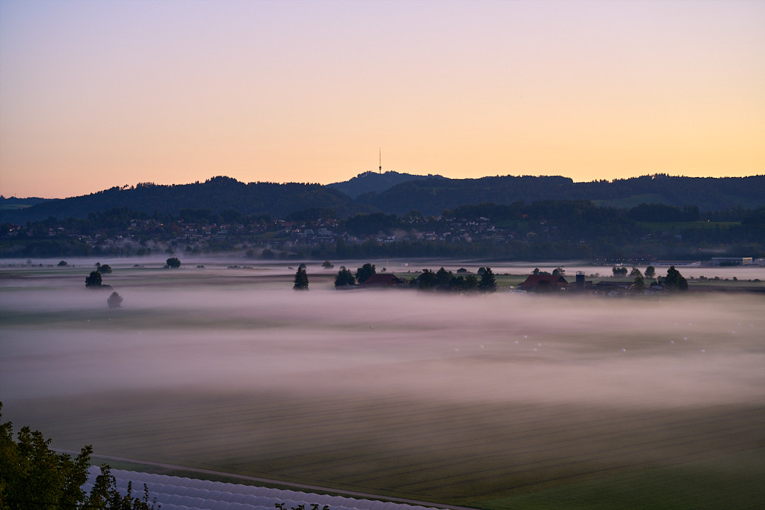 Links ist ein Bild vom Belpmoos an einem Herbstmorgen.